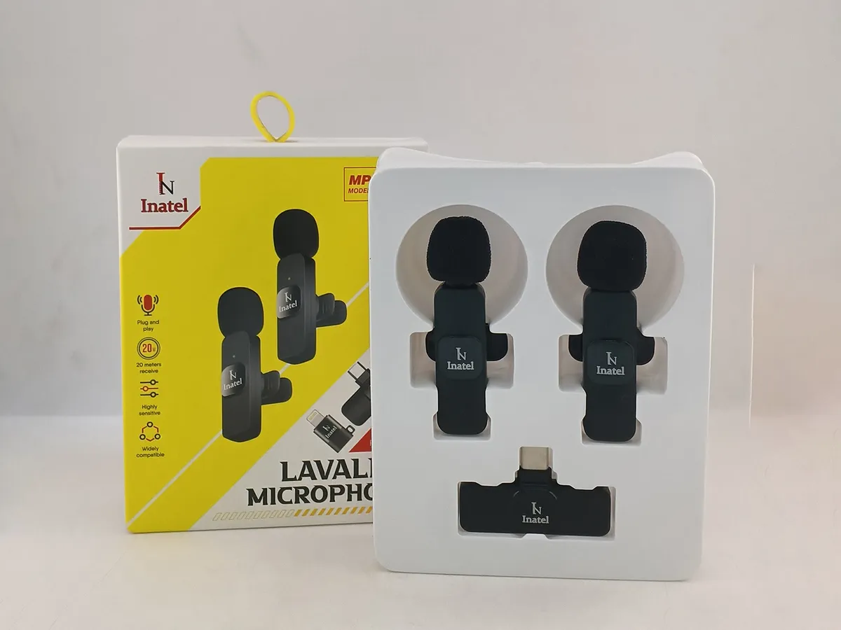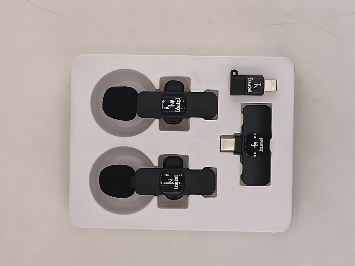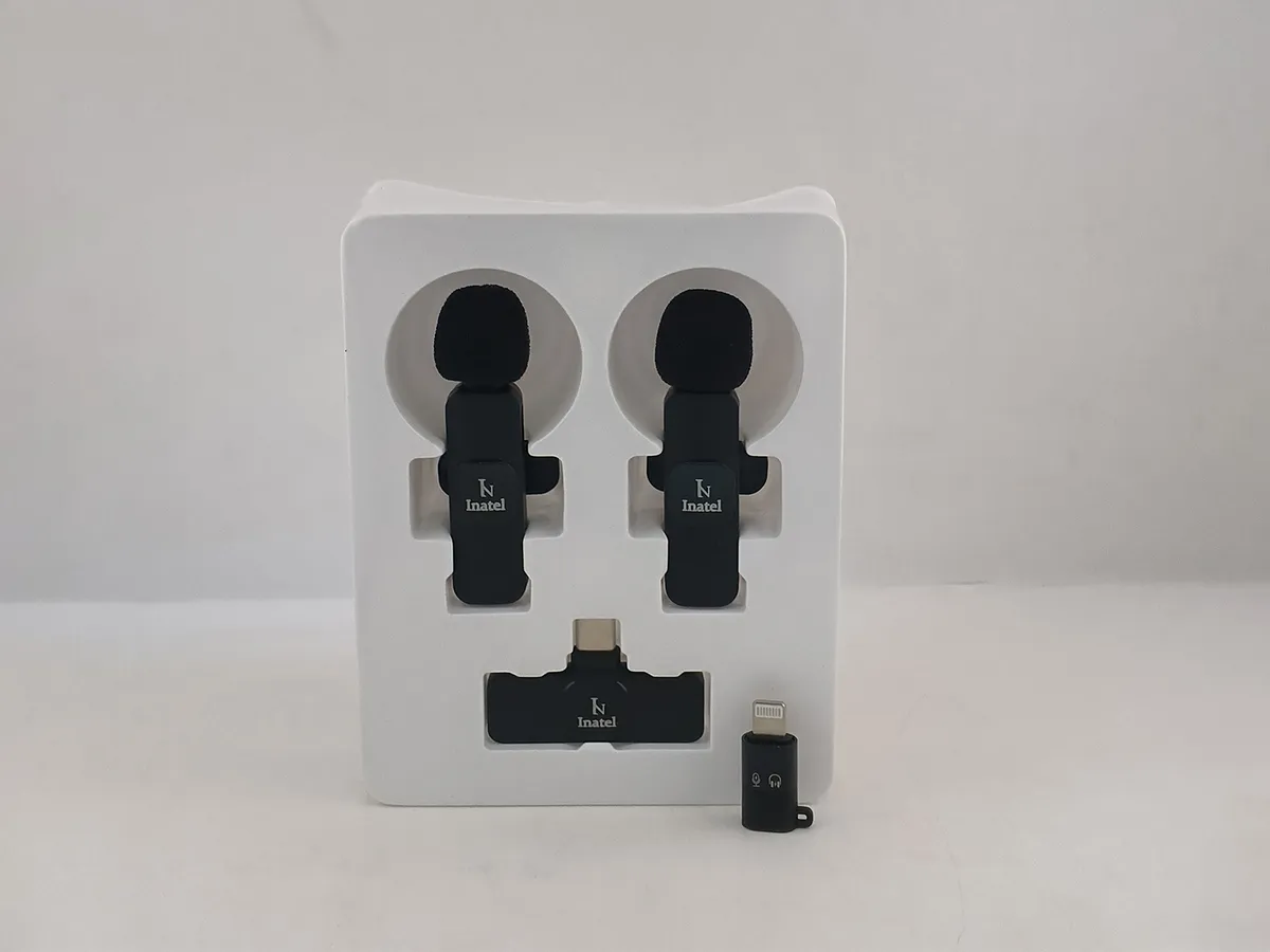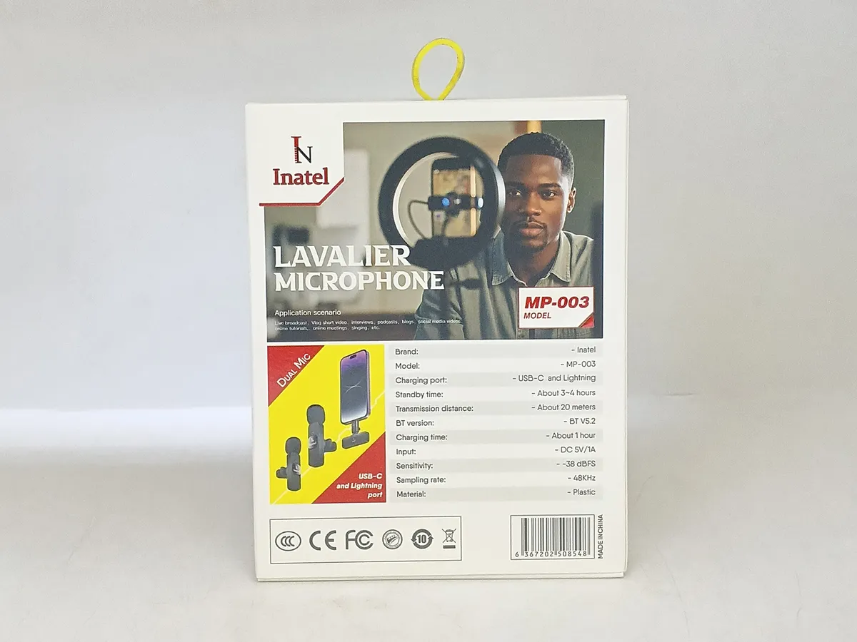 Plug and play 20 meters receive Highly sensitive Widely compatible Charging port: USB-C and Lightning Standby time: About 20 Meters BT version: BT V5.2 Charging time: About 1 hour Input: DC 5V/1A Sensitivity: -38 dBFS Sampling rate: -48KHz Material: Plastic